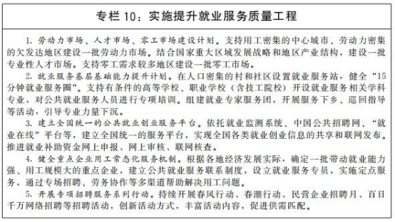 國發〔2021〕14號 各省、自治區、直轄市人民政府,國務院各部委、各直屬機構: 現將《“十四五”就業促進規劃》印發給你們,請認真貫徹執行。 國務院 2021年8月23日 (此件公開發布) “十四五”就業促進規劃 就業是最大的民生,也是經濟發展最基本的支撐。“十四五”時期,實現更加充分更高質量就業,是推動高質量發展、全面建設社會主義現代化國家的內在要求,是踐行以人民為中心發展思想、扎實推進共同富裕的重要基礎。本規劃依據《中華人民共和國國民經濟和社會發展第十四個五年規劃和2035年遠景目標綱要》編制,提出了“十四五”時期促進就業的指導思想、基本原則、主要目標、重點任務和保障措施,是推動就業高質量發展的工作指引。 一、發展環境 “十三五”期間,面對錯綜復雜的國際形勢、艱巨繁重的國內改革發展穩定任務特別是新冠肺炎疫情的嚴重沖擊,黨中央、國務院始終堅持以人民為中心,將就業擺在經濟社會發展優先位置,創新實施就業優先政策,推動就業工作取得積極進展。全國城鎮新增就業6564萬人,城鎮調查失業率均值控制在5.2%,勞動年齡人口平均受教育年限從10.2年提高到10.8年,技能勞動者總量由1.3億人增至2億人,就業形勢總體穩定,就業結構持續優化,就業質量不斷提升。 “十四五”時期是我國全面建成小康社會、實現第一個百年奮斗目標之后,乘勢而上開啟全面建設社會主義現代化國家新征程、向第二個百年奮斗目標進軍的第一個五年。當前和今后一段時期,我國發展仍然處于重要戰略機遇期,黨中央、國務院高度重視就業問題,實施就業優先戰略,為實現更加充分更高質量就業提供了根本保證;我國已轉向高質量發展階段,以國內大循環為主體、國內國際雙循環相互促進的新發展格局加快構建,經濟穩中向好、長期向好,為就業長期穩定創造了良好條件;新一輪科技革命和產業變革深入發展,新興就業創業機會日益增多;新型城鎮化、鄉村振興孕育巨大發展潛力,新的就業增長點不斷涌現;勞動力市場協同性增強,勞動力整體受教育程度上升,社會性流動更加順暢,為促進就業夯實了人力資源支撐。 但也要看到,“十四五”時期就業領域也出現了許多新變化新趨勢。人口結構與經濟結構深度調整,勞動力供求兩側均出現較大變化,產業轉型升級、技術進步對勞動者技能素質提出了更高要求,人才培養培訓不適應市場需求的現象進一步加劇,“就業難”與“招工難”并存,結構性就業矛盾更加突出,將成為就業領域主要矛盾。城鎮就業壓力依然較大,促進高校畢業生等重點群體就業任務艱巨,在工業化、城鎮化進程中,還有大量農村富余勞動力需要轉移就業,規模性失業風險不容忽視。同時,就業歧視仍然存在,靈活就業人員和新就業形態勞動者權益保障亟待加強;人工智能等智能化技術加速應用,就業替代效應持續顯現;國際環境日趨復雜,不穩定性不確定性明顯增加,對就業的潛在沖擊需警惕防范。總之,就業形勢仍較嚴峻。必須深刻認識就業領域主要矛盾的變化,深入分析面臨的挑戰和風險,堅持問題導向,采取務實舉措,抓住機遇,調動各種積極因素,不斷開創就業工作新局面,努力實現更加充分更高質量就業。 二、總體要求 (一)指導思想。 以習近平新時代中國特色社會主義思想為指導,深入貫徹黨的十九大和十九屆二中、三中、四中、五中全會精神,統籌推進“五位一體”總體布局,協調推進“四個全面”戰略布局,堅持穩中求進工作總基調,立足新發展階段,完整、準確、全面貫徹新發展理念,構建新發展格局,統籌發展和安全,以實現更加充分更高質量就業為主要目標,深入實施就業優先戰略,健全有利于更加充分更高質量就業的促進機制,完善政策體系、強化培訓服務、注重權益保障,千方百計擴大就業容量,努力提升就業質量,著力緩解結構性就業矛盾,切實防范和有效化解規模性失業風險,不斷增進民生福祉,推動全體人民共同富裕邁出堅實步伐。 (二)基本原則。 ——堅持就業導向、政策協同。繼續把就業擺在經濟社會發展和宏觀政策優先位置,作為保障和改善民生頭等大事,把穩定和擴大就業作為宏觀調控的優先目標和經濟運行合理區間的下限,根據就業形勢變化,及時調整宏觀政策取向、聚力支持就業。 ——堅持擴容提質、優化結構。兼顧容量、質量與結構,抓住主要矛盾,在多措并舉創造更多高質量就業崗位的同時,更加重視日益凸顯的結構性就業矛盾,聚焦勞動者技能素質提升,突出抓好技術技能人才培養培訓,推動形成勞動力市場更高水平的供需動態平衡。 ——堅持市場主導、政府調控。推動有效市場和有為政府更好結合,既要堅持市場化社會化就業方向,加快破除制約就業的體制機制障礙,充分發揮市場配置勞動力資源的決定性作用,又要強化政府責任,優化整合各類資源,為促進就業提供強有力政策支持和基礎性服務保障。 ——堅持聚焦重點、守住底線。緊盯就業領域關鍵環節和突出問題,瞄準重點地區、重點行業和重點群體,制定更加精準有效的舉措,因地因企因人強化分類幫扶援助,切實兜牢民生底線。 (三)主要目標。 到2025年,要實現以下目標: ——就業形勢總體平穩。城鎮新增就業5500萬人以上,努力實現更大規模,城鎮調查失業率控制在5.5%以內,重點群體就業保持穩定。城鄉、區域就業機會差距逐步縮小,勞動力