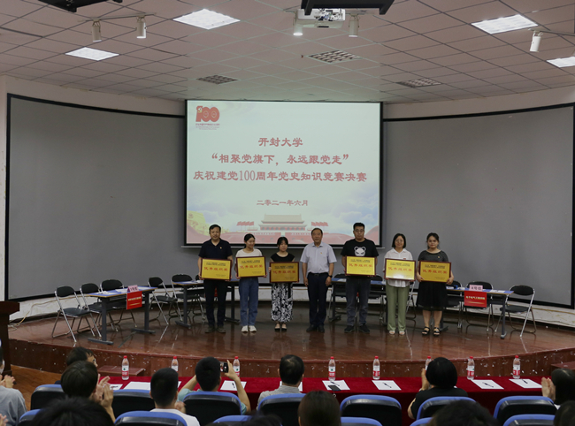 本站訊 為慶祝中國共產黨成立100周年,深入貫徹習近平總書記在黨史學習教育動員大會上的講話精神,6月17日,由校黨委組織統戰部主辦、旅游學院黨總支承辦的“相聚黨旗下,永遠跟黨走”開封大學慶祝建黨100周年黨史知識競賽決賽在國際教育學院一樓報告廳舉行。校黨委副書記儲建新,校黨委委員、組織統戰部部長趙海勝、旅游學院黨總支書記尤影、后勤管理服務中心主任徐紀珂、后勤管理服務中心黨支部書記田路春以及各院部師生代表出席活動。