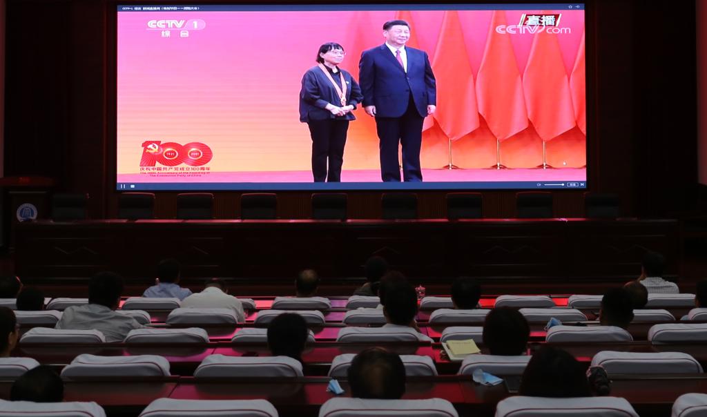 6月29日上午10時,慶祝建黨100周年“七一勛章”頒授儀式在人民大會堂隆重舉行,習(xí)近平總書記首次頒授“七一勛章”并發(fā)表重要講話。我校領(lǐng)導(dǎo)陳燦、儲建新、萬是明、馬林強、謝文忠及機關(guān)處室的科級以上干部在行政樓一樓會議廳主會場觀看頒授儀式,各院部分別設(shè)立分會場組織教職工觀看頒授儀式,共同見證這一偉大時刻。
