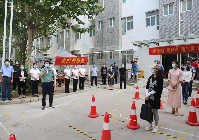 本次演練嚴格按照有關規定和流程進行,設置了學生返校報到、進入宿舍、餐廳就餐、教室上課和發熱處置五個場景,分別在學校南大門、5號宿舍樓、東苑餐廳、15#104教室和校醫務室實地進行演練。演練開始前,儲書記就本次演練的重點、學生返校可能遇到的問題及觀摩人員注意事項提出了具體要求。