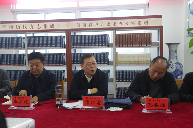 管仁富是河南地方史志系統的領軍人物,政策理論水平較高,尤其注重對理論與實踐結合問題的研究。今年4月,管主任代表河南省地方史志辦公室向我校捐贈了價值30余萬元的《河南歷代方志集成》,對我校的文化建設給予了極大的支持。