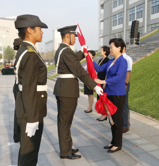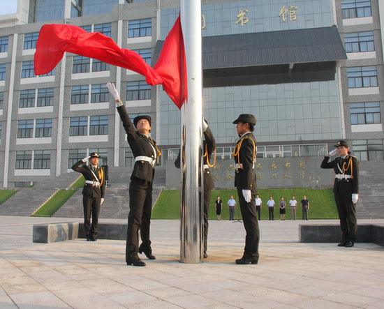 校國旗護衛隊的旗手從校黨委書記張新梅手中迎過鮮艷的五星紅旗,在莊嚴雄壯的國歌聲中,將五星紅旗冉冉升起,全校師生行注目禮。