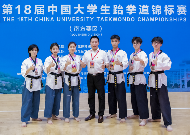 本站訊 5月21日至24日,由中國學生體育聯合會主辦、中國學生體育聯合會大學跆拳道分會執行的“第18屆中國大學生跆拳道錦標賽(南方賽區)”在長沙市明德中學體育館隆重舉行。來自全國200多所高校的近2000名跆拳道運動員參加本次比賽。我校共斬獲2金2銀1銅,6名參賽隊員全部獲得全國總決賽資格。