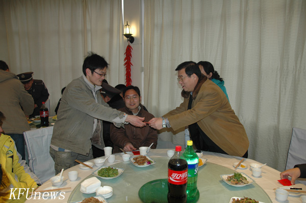 在除夕夜的團圓晚宴上,拜校長代表校黨委、校行政向春節(jié)留校的師生員工們拜年,為大家獻上了美好的祝愿,并向每一位留校同學(xué)發(fā)放了壓歲錢紅包。隨后,師生們坐在一起觥籌交錯、談笑風(fēng)生,在歡快、熱烈的氛圍中迎接農(nóng)歷新年的到來。