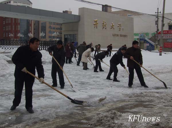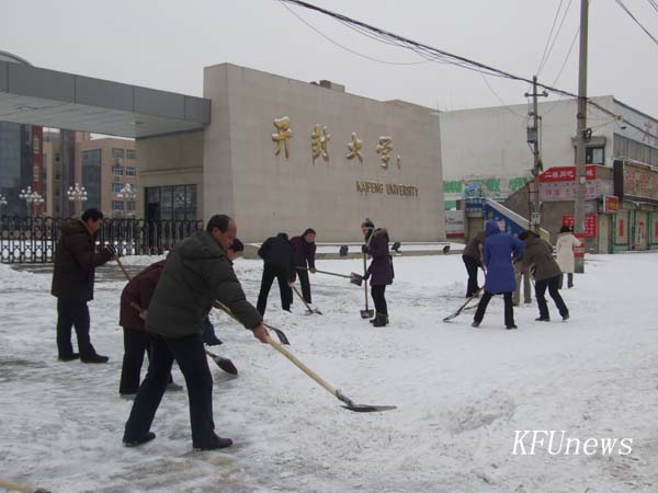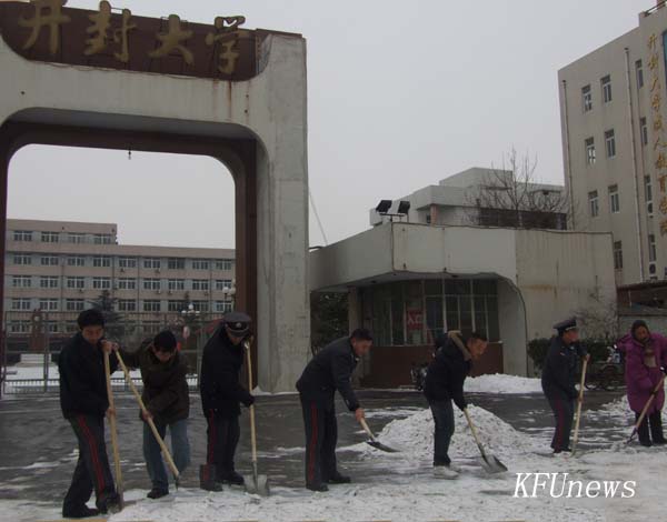 本站訊 今天是2010年2月11日,農歷臘月二十八,新年將至,昨夜開封又喜降瑞雪。今天一大早,校長拜五四和我校教職工自發組織在學校南北大門和校內清掃積雪。在清掃積雪過程中,大家歡聲笑語,熱火朝天,流露出迎慶新年的喜悅。