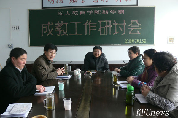 本站訊 3月15日上午,副校長萬是明來到成人教育學院主持召開新學期成教工作研討會,學院科級以上干部參加會議。
