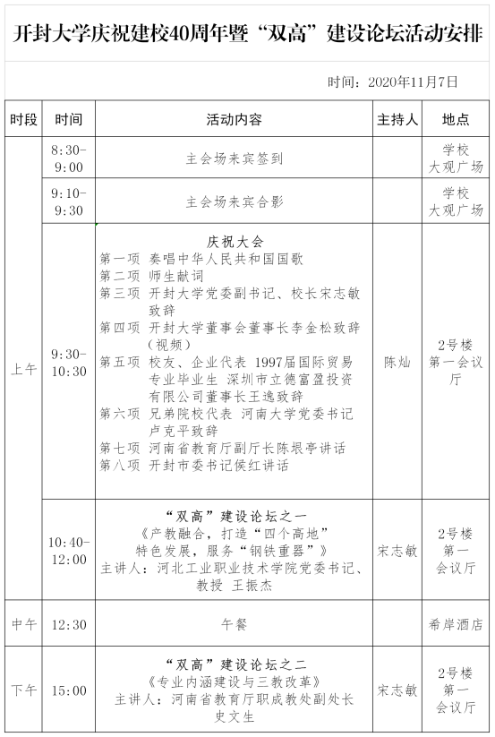 承蒙社會各界廣泛關注,校友熱切期盼,全體師生員工積極響應,開封大學慶祝建校40周年暨“雙高”建設論壇將于11月7日隆重召開。為方便社會各界、校友來校參加慶祝活動,現將11月7日活動安排公告如下: