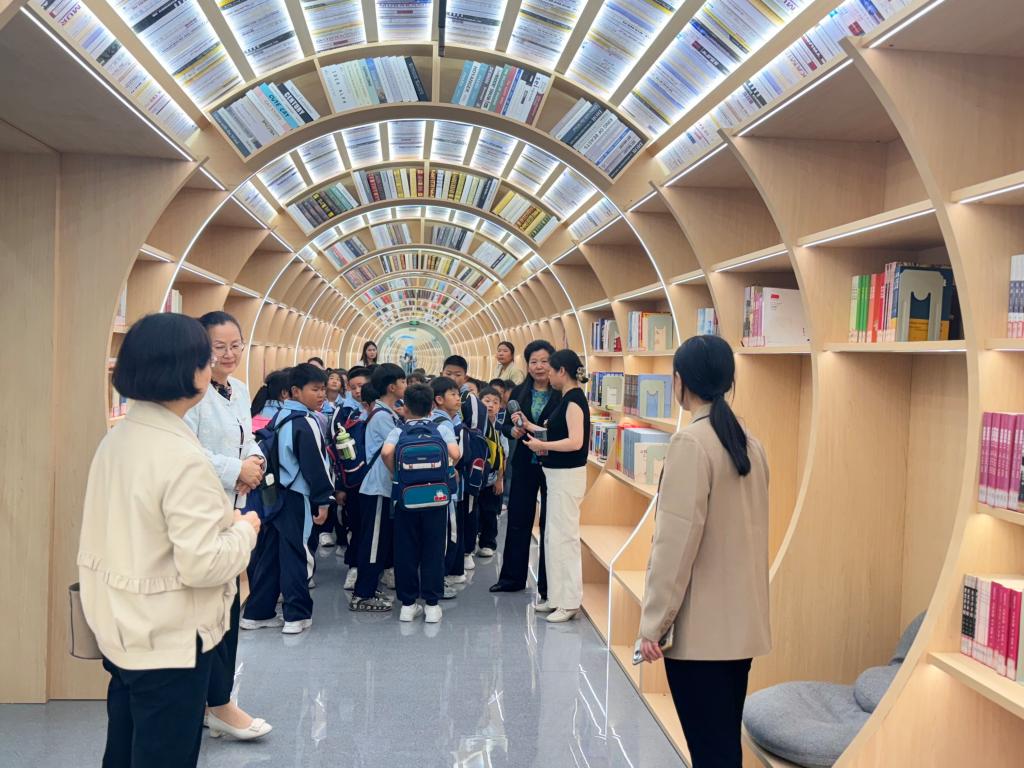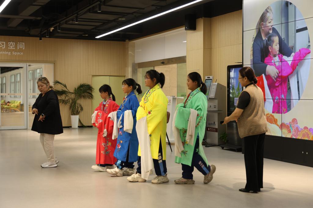 活動第二個環節,學生組成 “中華優秀傳統文化探索團”,在開封大學圖書館開啟了一場觸摸千年文脈與探秘千年的書香之旅。工作人員帶領學生們穿梭于書架間,介紹圖書館的特色線裝古籍藏書與“弘揚傳統精粹 共筑書香高地”等各類閱讀推廣活動;圖書館“時光隧道”所體現的前沿科技與傳統文化的融合,讓學生們驚嘆不已。在以“古風雅韻”為核心主題的中國傳統服飾文化展廳,古典服飾與古風畫卷相得益彰。