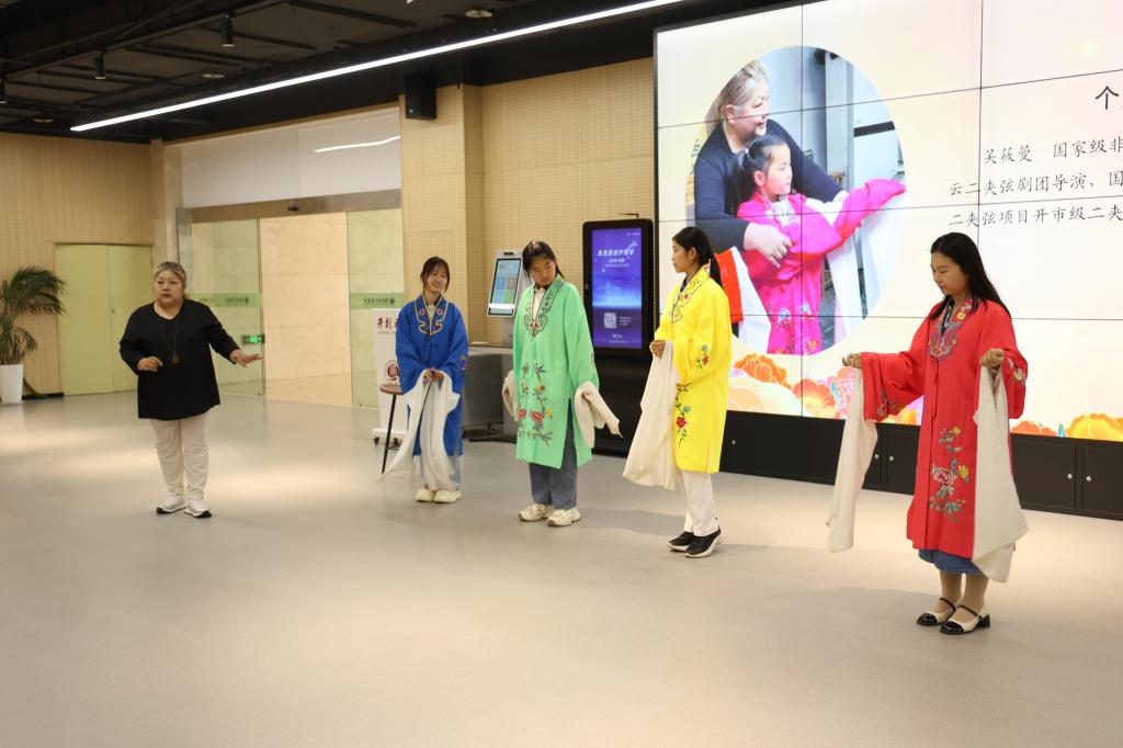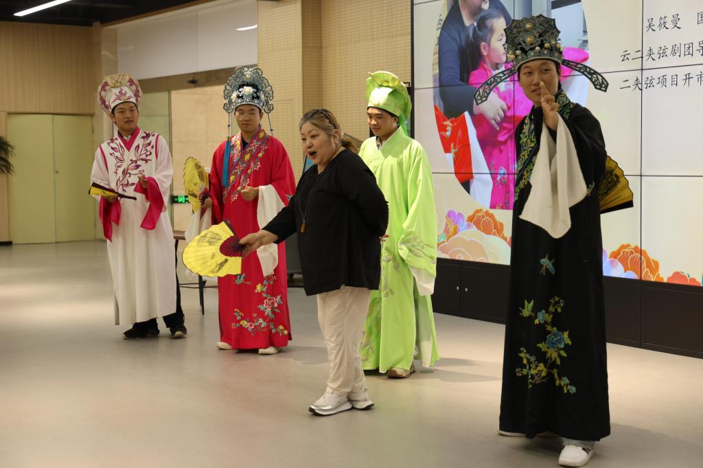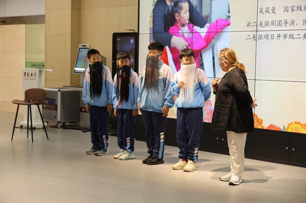 吳筱曼帶領師生代表體驗了二夾弦的表演服飾和部分戲曲技藝。學生們手持戲曲道具,在老師的指導下學唱經典選段;模仿臺步、手勢,沉浸式體驗戲曲表演的精髓。“原來二夾弦的唱腔這么有韻味,親身體驗才發現每個動作都藏著大學問。” 來自開封市金明中學的一位學生感嘆道。這場寓教于樂的公開課,讓非遺藝術不再遙不可及,而是化作可觸摸、可參與的鮮活體驗。