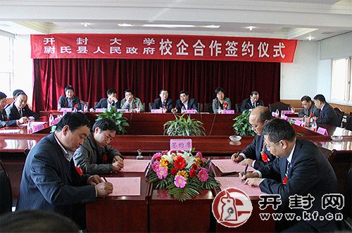 開封大學與尉氏縣人民政府簽訂了戰略合作協議,開封大學6個學院的院長和尉氏縣的6家與會企業負責人分別簽訂了校企合作協議。