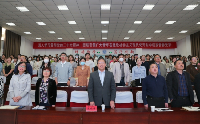 報告中,王亞文講述了《滿江紅》詞牌的來歷、岳飛的兩首《滿江紅》和岳飛之后的《滿江紅》,引導(dǎo)師生們?nèi)ジ惺苊褡逵⑿鄣某嗄懼倚?,體會愛國主義的真諦,啟發(fā)師生們用實際行動去愛國。報告尾聲,在王亞文的提議下,全體師生集體朗誦《滿江紅》,將會場氣氛推向了高潮。