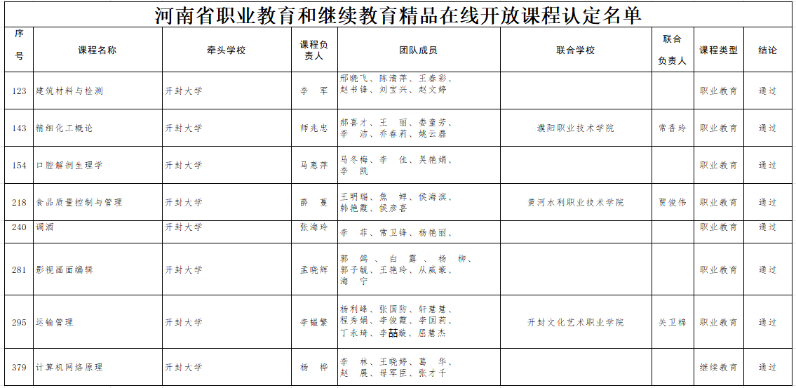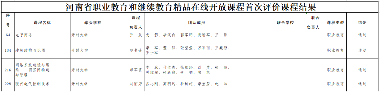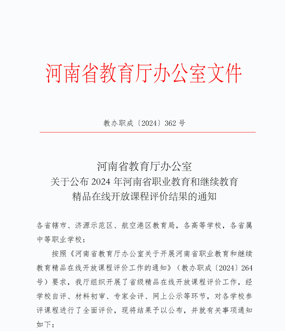 近日,河南省教育廳下發《河南省教育廳辦公室關于公布2024年河南省職業教育和繼續教育精品在線開放課程評價結果的通知》(教辦職成〔2024〕362號),我校立項建設的12門課程全部獲得評價通過,其中《電子商務》、《建筑結構與識圖》等4門課程通過首次評價;《精細化工概論》、《口腔解剖生理學》等8門課程通過二次評價,并被認定為河南省職業教育和繼續教育精品在線開放課程。