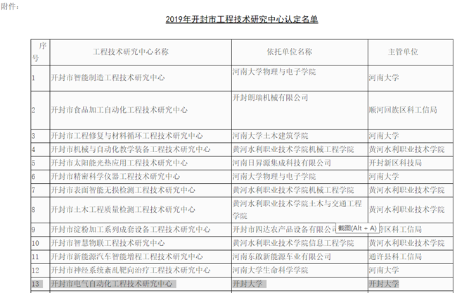 近日,從開封市科學(xué)技術(shù)局網(wǎng)站獲悉,由我校電子電氣工程學(xué)院副院長高明遠(yuǎn)教授主持申報的“開封市電氣自動化工程技術(shù)研究中心”獲得立項建設(shè)。