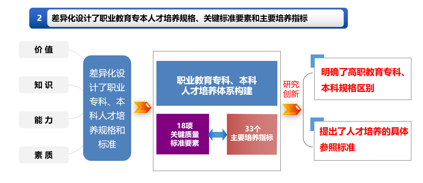 根據職業本科的特殊屬性及經濟社會發展對人才素質規格的具體要求,從價值、知識、能力、素質四個維度差異化設計了以職業教育專本人才培養規格、18項關鍵培養標準要素和33個主要課程模塊為內容的人才培養質量標準體系,為職業本科教育教學改革提供了具體參照標準。