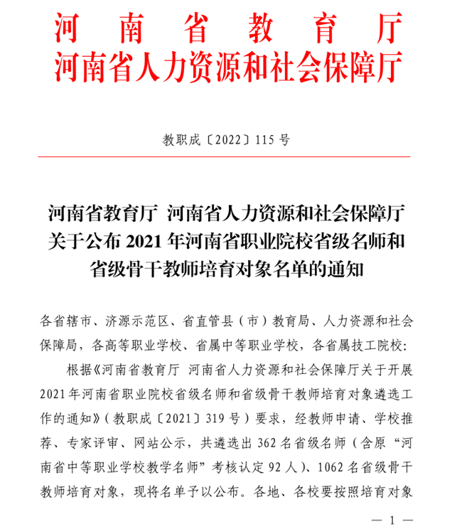 本站訊 近日,河南省教育廳、河南省人力資源和社會保障廳發布了《河南省教育廳河南省人力資源和社會保障廳關于公布2021年河南省職業院校省級名師和省級骨干教師培育對象名單的通知》(教職成〔2022〕115號)。我校李治、師兆忠、李軍、趙書鋒4位教師被評為2021年河南省職業院校省級名師培育對象,李響、劉悅、王曉婷、邊疆、蔣大山、李林6名教師被評為2021年職業院校省級骨干教師培育對象。