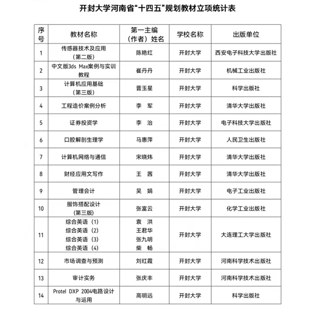 作者: 時間:2022-06-04近日,河南省教育廳公布了“十四五”普通高等教育規劃教材立項建設名單,我校14部教材獲批河南省“十四五”普通高等教育規劃教材立項,其中4本教材獲教育廳推薦申報國家“十四五”規劃教材。