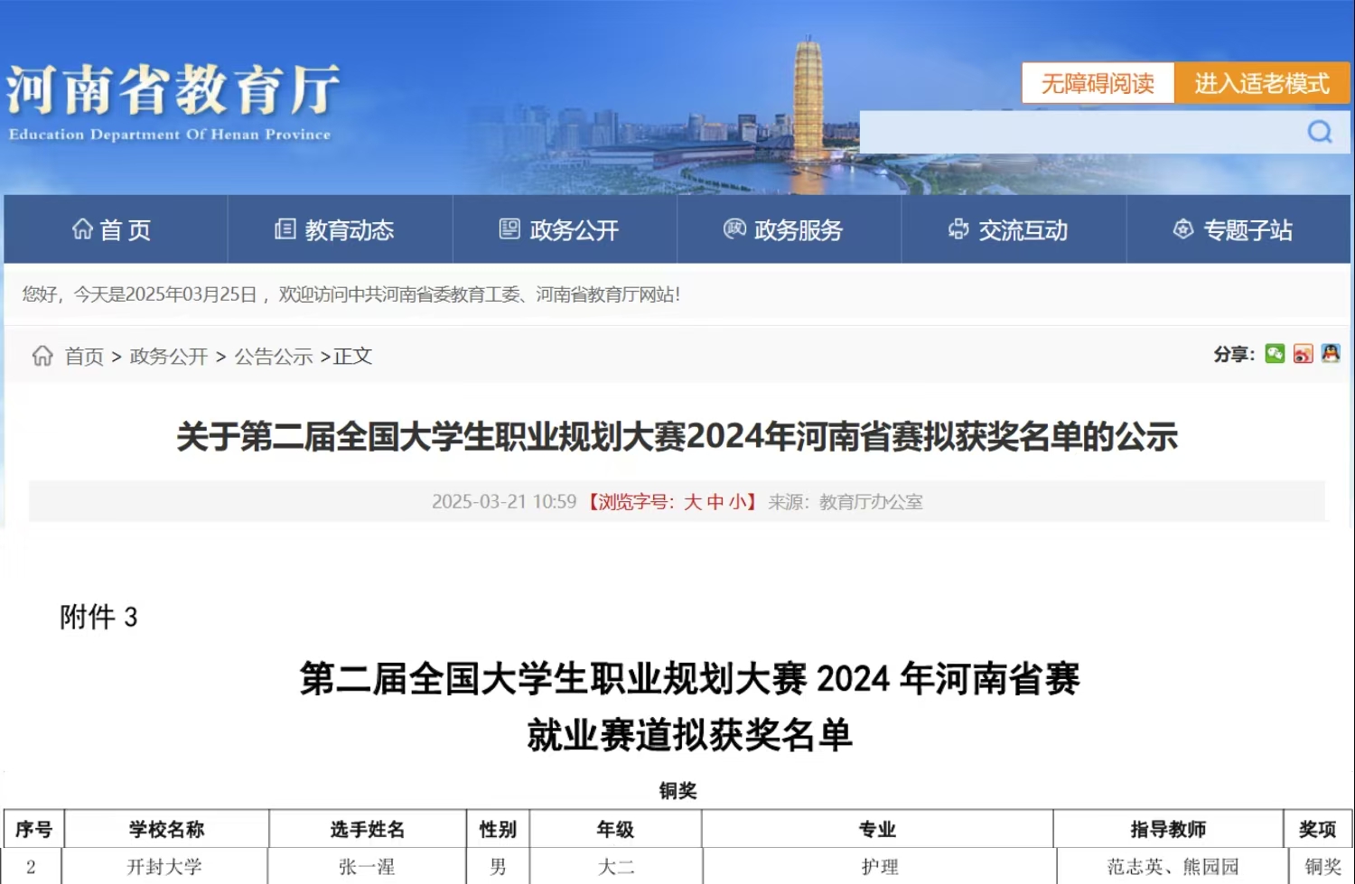 近日,在第二屆全國大學生職業生涯規劃大賽河南省賽中,我院學子2023級護理專業學生張一湦,在醫學院領導的大力支持下,在范志英老師和熊園園老師的指導下憑借出色的職業規劃能力和現場表現,斬獲佳績,榮獲省級銅獎!